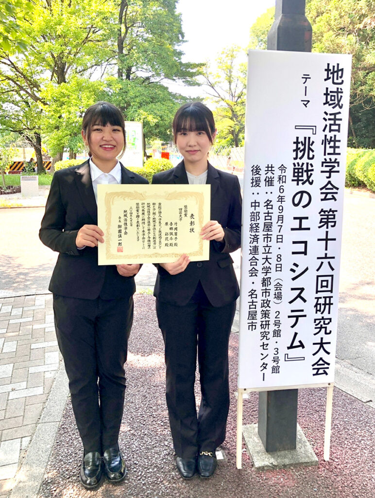 「地域活性学会第16回研究⼤会」奨励賞受賞! 2025 12/30 令和6年9⽉8⽇(日)、愛知県名古屋市の名古屋市立⼤学で開催された「地域活性学会第16回研究⼤会」において、SBCに所属するメディア情報学科の片岡眉子と書道文化学科の原彩花が発表した論⽂が奨励賞を受賞しました。 おしらせ 局員情報 四国大学放送局 令和7年度第4回SBCニュースについて